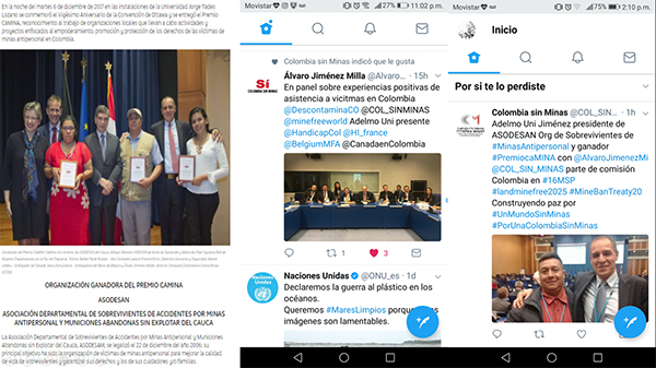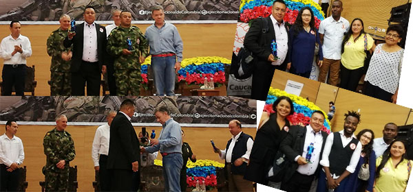 ASODESAM presente en la entrega de los 36 municipios libres de sospecha de minas 2 de ellos del departamento del Cauca, Adelmo Uni Jimenez recibe el reconocimiento como representante de los sobrevivientes civiles de minas antipersonal.